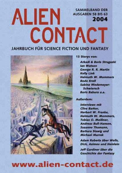 Das |AC Jahrbuch 2004| ist das erste, das mir vorgelegt wurde und besticht durch seine Vielfältigkeit. Das Jahrbuch für Science-Fiction und Fantasy befasst sich jedoch vorrangig mit dem SF-Genre, wenngleich die Grenzen zur Fantasy ja häufig fließend sind. Inhalt dieses Bandes sind die Highlights der Ausgaben 58 bis 63 des Online-Magazines ALIEN CONTACT – seit seiner Gründung im Jahr 1990 ein Magazin für SF und Fantasy, das Erzählungen und Sachbeiträge überwiegend zur SF bietet. Der Herausgeber Hardy Kettlitz, der sich im Vorwort fragt, ob 2004 ein gutes Jahr für die SF war, hat hier bei der Auswahl ein sehr glückliches Händchen bewiesen. Neben den Storys, von denen für mich „Laq’lir“ und „Ein geeignetes Forschungsobjekt“ (köstlich!: kurz und humorvoll) von Sabine Wedemeyer-Schwiersch, „Invasion der Uranier“ von Ian Watson und „Symbiose“ von Marco-Ivo Schubert zu den besten zählen, wird Infotainment vom Feinsten geboten.
